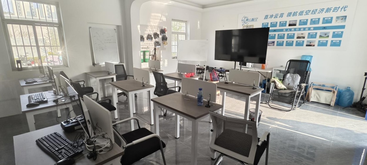 同时满足至少20人进行理论知识学习,配备教学用智慧大屏、飞行模拟系统及遥理论教室控器,助力学员轻松应对理论考题。